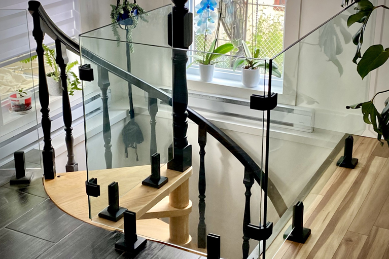 Dans ce projet, nous avons modernisé un escalier existant en remplaçant les anciennes composantes par un garde-corps en verre trempé avec supports noirs mats.