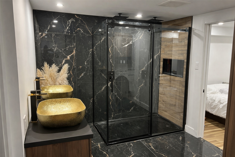 Nous avons entièrement refait le plancher et les murs avec une céramique grand format effet marbre noir, rehaussée de veines dorées naturelles, créant un impact visuel spectaculaire dès l’entrée. La douche vitrée sur mesure, avec quincaillerie noire mate et porte coulissante, apporte une touche contemporaine tout en maximisant la luminosité.